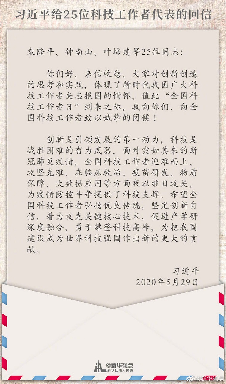 5月29日,在第四個“全國科技工作者日”到來之際,譚旭光等25位科技工作者代表收到了習近平總書記的回信。